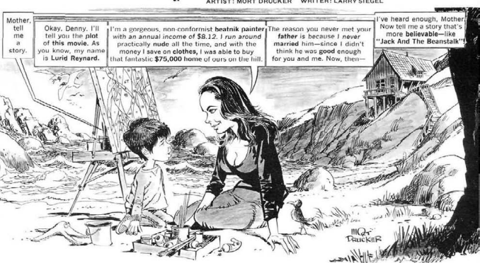 I read the first panel aloud to my grandmother because gauging her reaction was how to learn usage: a kid asks his mother with the zowie cleavage to tell him a story. “Okay. I’ll tell you the plot of this movie,” I read to Grandma. ”My name is Lurid Reynard. I’m a gorgeous, non-conformist beatnik painter with an annual income of $8.12. I run around practically nude all the time, and with the money I save on clothes, I was able to buy that fantastic $75,000 home of ours on the hill.” [the original prosody, which never fit my own birdsong]