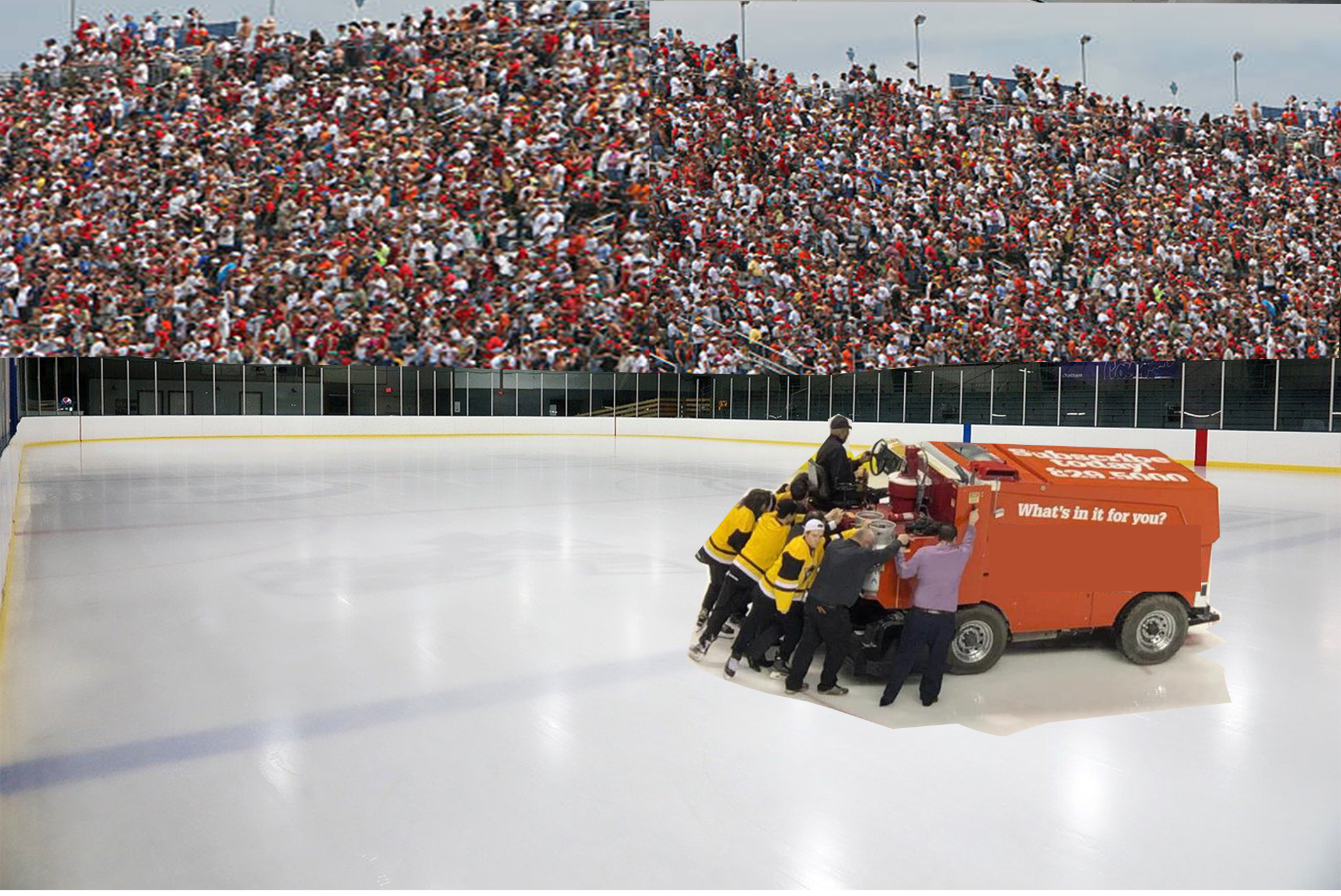 On the ice, the steamer presses forward. Other young workers swarm all over the craft, trying to move levers or mash buttons without results. The spectators in the path of the behemoth move to safer real estate, farther from the edge of the pond. Meanwhile, an older man wearing coveralls that lack the reflective, Danger Orange stripes and patches on the jumpsuits of the rest of the workers, slowly folds himself over the white fence surrounding the rink, the kind of movement men past middle age learn is as useful as being able to jump off the ground but a lot safer and a lot more likely.
